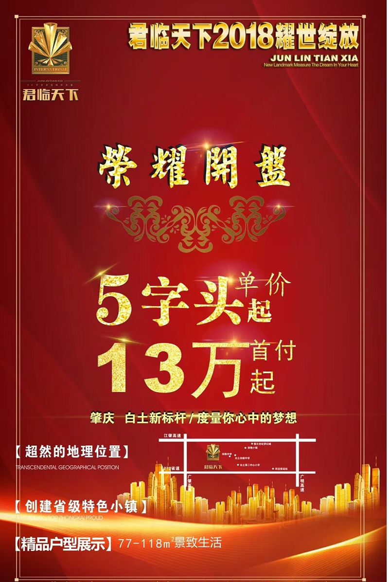 恭喜成为《君临天下》新业主,四月份买房光宗耀祖!肇庆白土君临天下正常上客,正常认购!单价5字头,总价30万住宅/公寓,54-111/㎡经典户型,配套完善,肇庆高要白土镇!