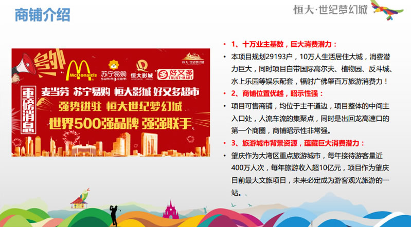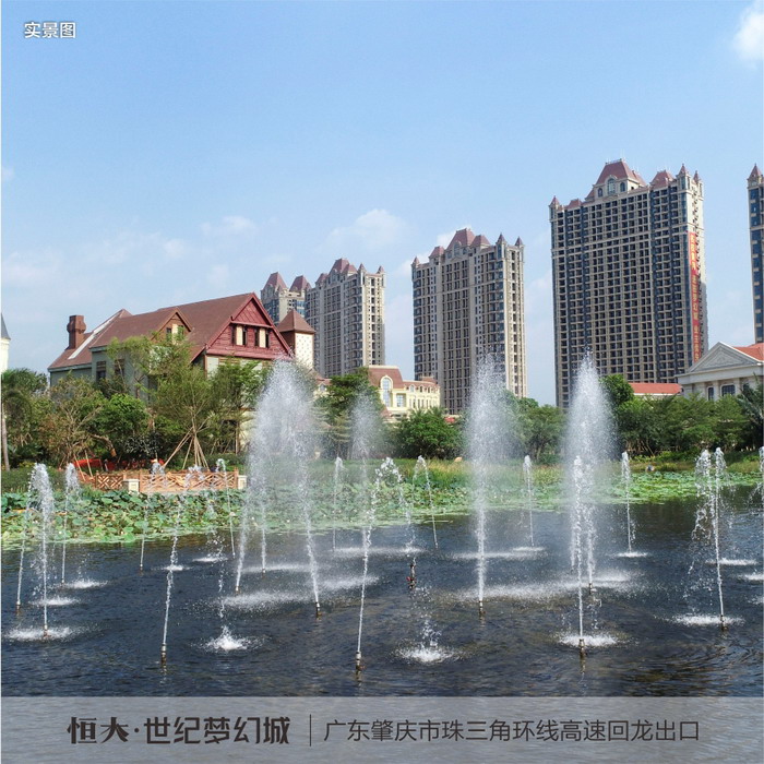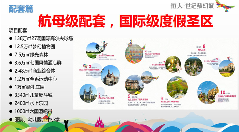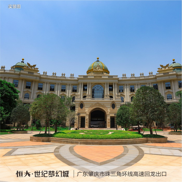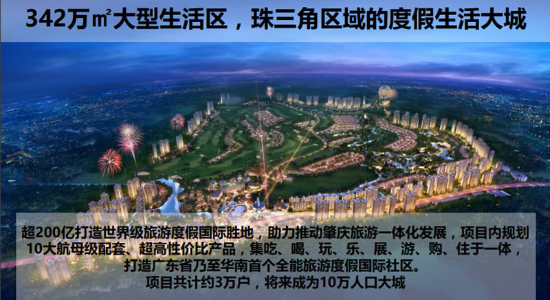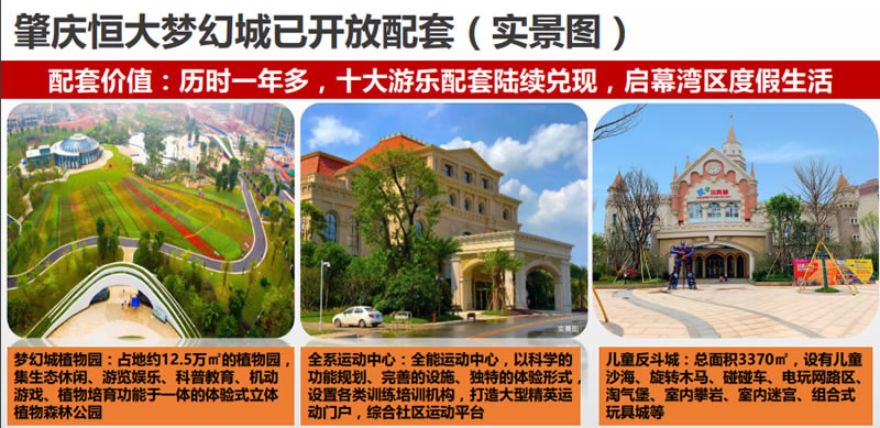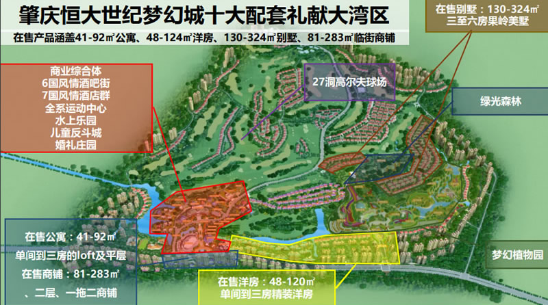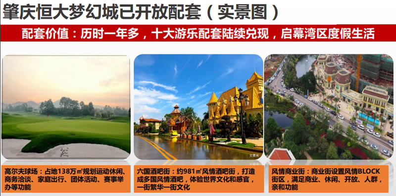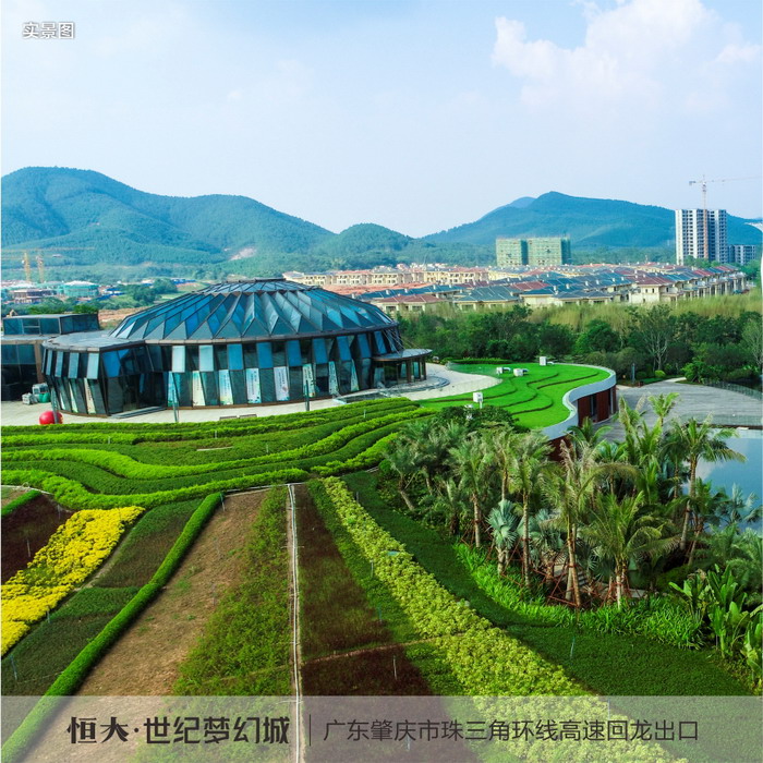 恒大世纪梦幻城, 500强企业恒大地产斥巨资打造的大型文化旅游项目,核心理念是打造珠三角地区集文化休闲、度假、游乐、居住于一体的旅游地产。项目占地约5130亩,项目规模 首期占地约342万㎡,总建面积约238万㎡;容积率1.66; 依托肇庆天然山水资源,规划有27洞高尔夫球场、绿光森林、梦幻植物园、七国风情酒店群、六国风情酒吧街、全系运动 、恒大影城、儿童玩具反斗城、儿童水上乐园、婚礼庄园、滨水商业天地等文化休闲、游乐设施;同时还规划有公寓、洋房、别墅等产品类型,环山绕水,错落布局,与五千亩山地湖泊相融合。