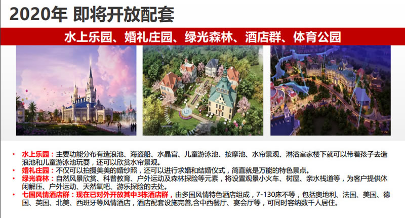 休闲配套 :约3.6万㎡7国风情酒店(待开放)(英、法、德、美、奥、北美)约980㎡6国风情酒吧街(已开放)(韩、匈、美、俄、葡、挪威)